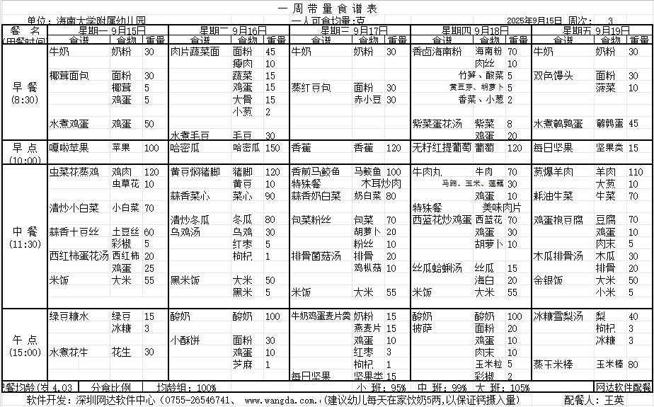 海南大学附属幼儿园2025年秋季第三周食谱公告
