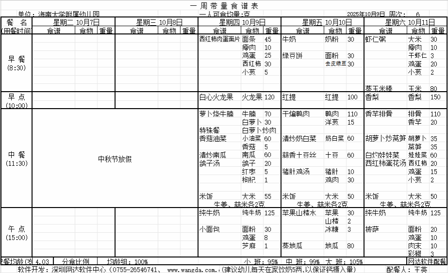 海南大学附属幼儿园2025年秋季第六周食谱公告