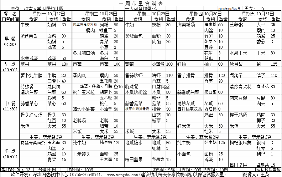 海南大学附属幼儿园2025年秋季第九周食谱公告