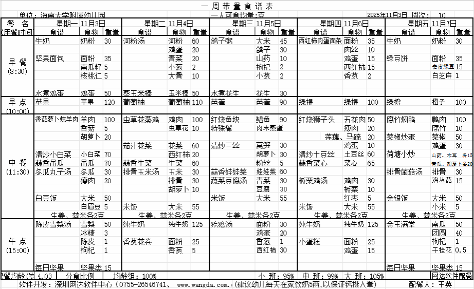 海南大学附属幼儿园2025年秋季第十周食谱公告