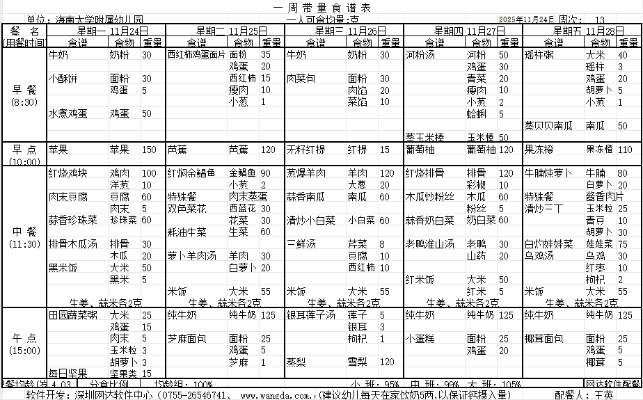 海南大学附属幼儿园2025年秋季第十三周食谱公告