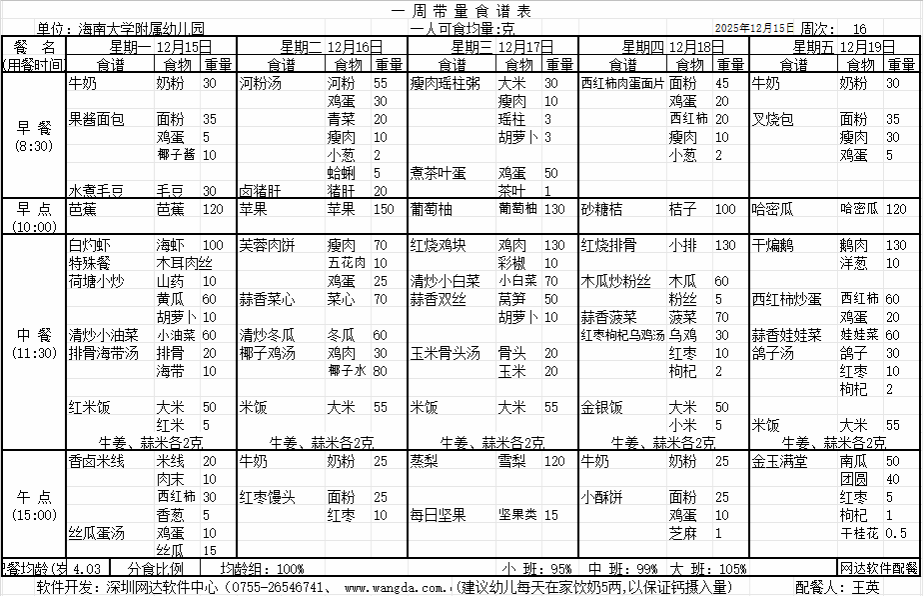 海南大学附属幼儿园2025年秋季第十六周食谱公告